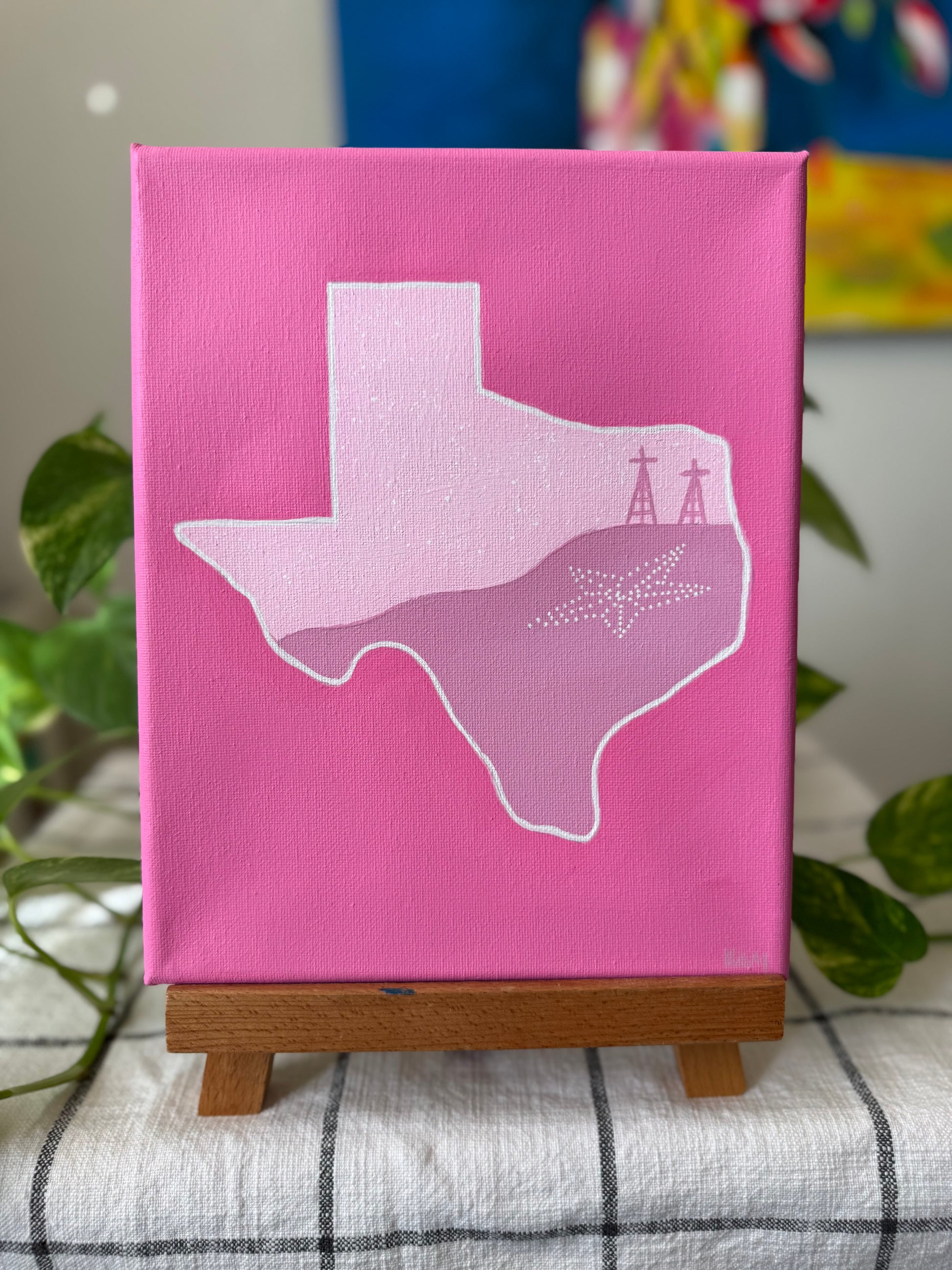 An original pop-of-color painting inspired by the pastel tones of sweetheart candies. Painted in layered hues of pink, this piece captures the glow of El Paso’s iconic star on the mountain in the shape of Texas