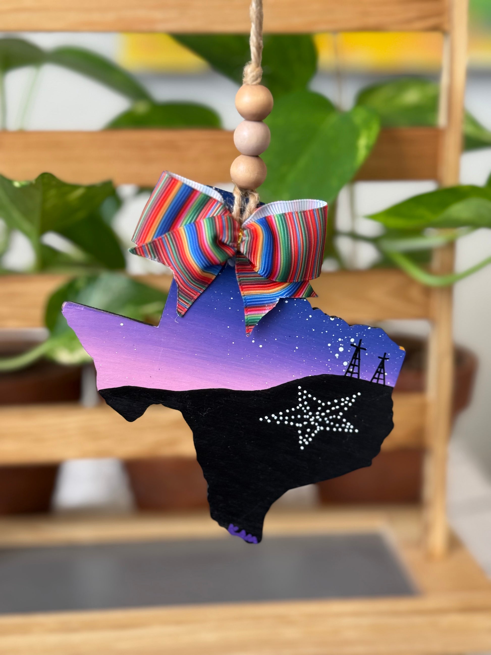 Cruise through the 915 in style with this hand-painted El Paso inspired car ornament! Every detail celebrates the heart of our city—the serape ribbon for our vibrant culture, a hand-painted sunset, and the iconic Star on the Mountain shining bright. The back features your choice of “home” or “El Paso”, making it a perfect keepsake or gift.